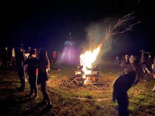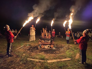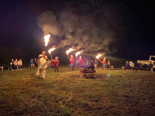 キャンプファイヤーがスタートしました。日が暮れるのが早くなっているので、真っ暗の中、火の神登場です。