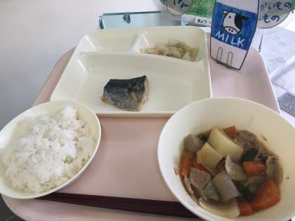 「魚の骨に気を付けて良く噛んで食べましょう」献立に魚がある日には校内放送を入れています。子どもたちは「はい!」と元気よく返事をして、とても気を付けて食べています。