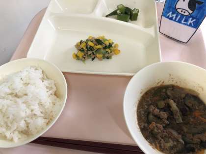 マーボーなす オクラの甘酢あえ ツナとチンゲンサイのいためもの ごはん 牛乳