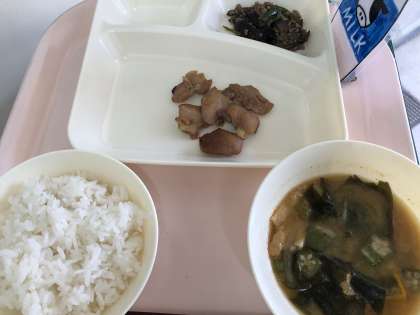 かぼちゃが入ったみそ汁はほんのりあまくてとてもおいしいです。1—4年生は「金曜日はお弁当だったからひさしぶり」などといいながら、今日も残さずにいただきました。。