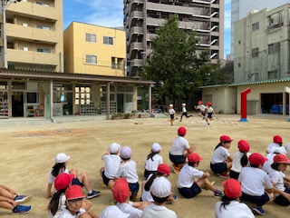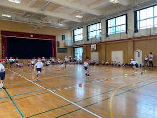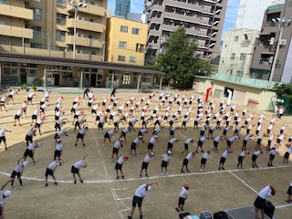 3,4年生の様子です。ラジオ体操では、指先までしっかりと伸ばし、きれいにそろっていました。