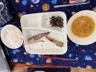 今日の給食食べ方講座は、「魚の食べ方」でした。給食委員会の子が、魚の骨の取り方を教えてくれました。子どもたちはそれを見ながら、骨をていねいに外していきました。「できたー」ときれいに取れた骨を見せてくれました。