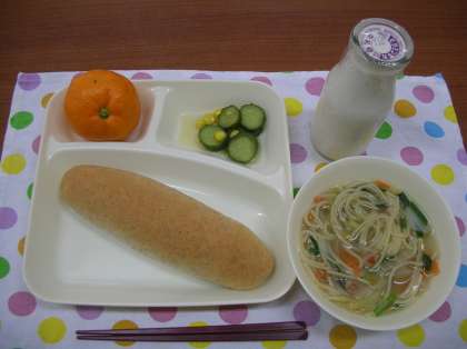 チャンポン、きゅうりとコーンの中華あえ、みかん、ライ麦パン、牛乳