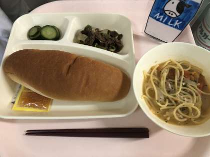 「ホタテ貝とトマトのスープスパゲッティ」はホタテ貝や生のトマトが入り、にんにくの効いた本格的な味でした。お弁当も皆うれしそうに食べていました。