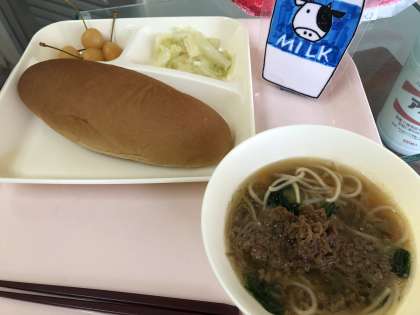 タンタンめん キャベツの甘酢づけ さくらんぼ缶 黒糖パン 牛乳