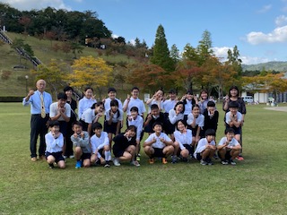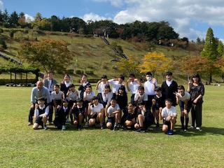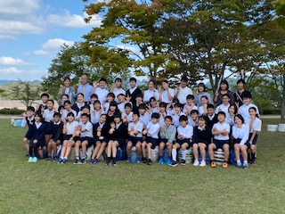 昼食後、広場の紅葉が綺麗だったので、クラスごとと全体の集合写真を撮りました。