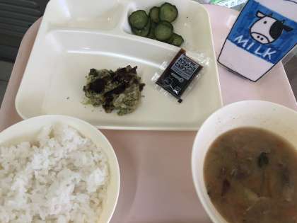 お好み焼き 豚汁 きゅうりの梅風味 ごはん 牛乳