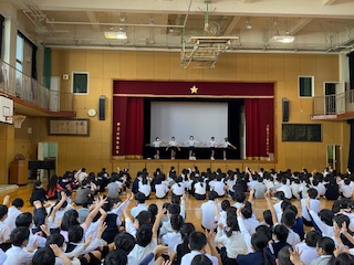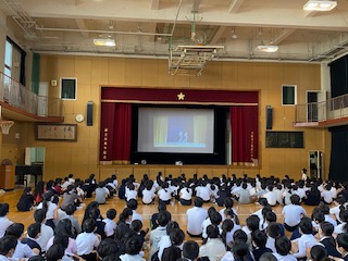 今朝の児童集会は、「○○は何人でしょう」クイズでした。スクリーンに映っている○○している人は何人か当てるクイズです。記憶力が試されるので、みんな集中して映像を見入っていました。