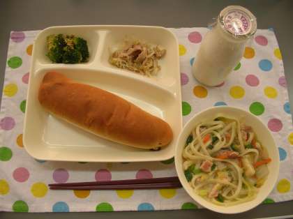 五目うどん、豚肉ともやしのいためもの、ブロッコリーのごまあえ、レーズンパン、牛乳