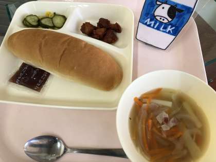 まぐろのオーロラ煮 ベーコンとじゃがいものスープ きゅうりとコーンのゆずドレッシング コッペパン いちごジャム 牛乳