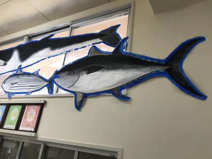 まぐろのオーロラ煮は油で揚げてから みそ、ケチャップ、砂糖を合わせたソースであえています。給食の代表メニューでもあります。今日はお刺身だ!と勘違いする子どももいました。隣の写真は給食室に掲示しているまぐろとかつおです。