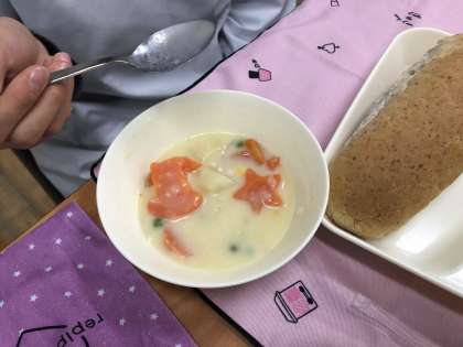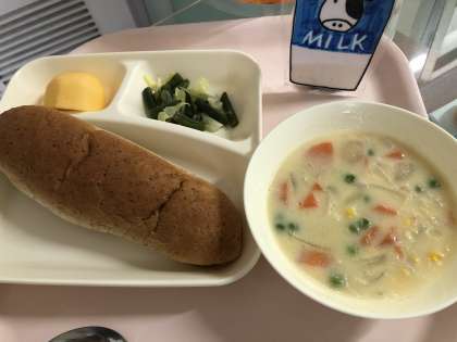 「コーンクリームシチュー」は小麦粉を使わずに、米粉でとろみをつけていますがとてもおいしく仕上がります。教室では次々とラッキー人参が現れて、子どもたちはとても嬉しそうに報告ラッシュの給食時間でした。