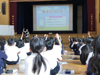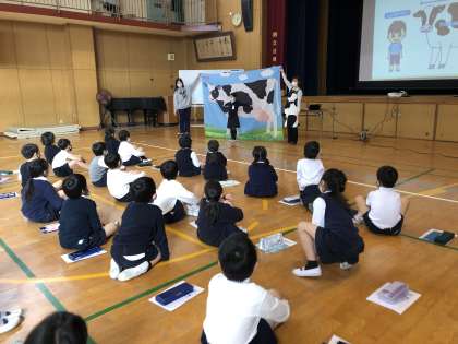 2年生の出前授業。乳牛や酪農について学ぶ「みるく教室」をしていただきました。乳牛の大きさや体重、食べる量に驚いたり、牛の一生、命をいただくにつながるお勉強ができました。