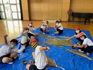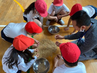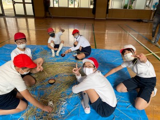 先日ふくふく広場で刈り取り、天日干ししていた稲を、脱穀しました。手作りのミニ千歯扱きを使って、稲から籾を取り外していきました。なかなかスムーズに外すことができなくて苦労しましたが、農家の方の大変さがわかり、とても貴重な体験でした。