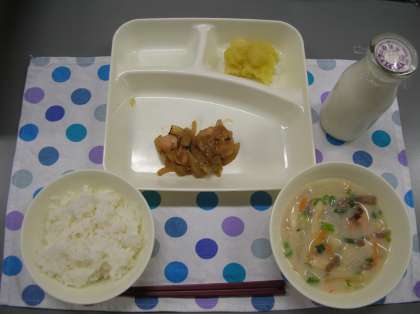 かす汁、鶏肉の甘辛焼き、くりきんとん、ごはん、牛乳