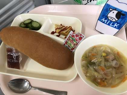 ツナポテトオムレツ スープ きゅうりのバジル風味サラダ コッペパン いちごジャム 牛乳