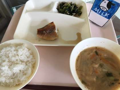 あかうおのしょうゆだれかけ みそ汁 こまつなのいためもの ごはん 牛乳
