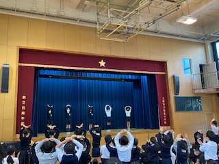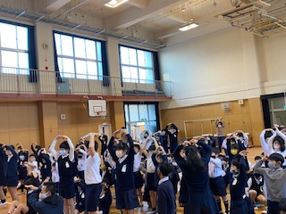 今朝の児童集会は、「○×💛、△はだめよゲーム」でした。集会委員会の子達が出したものとは違うジェスチャーができていたら勝ちというゲームです。子どもたちは「やったー勝った!」と盛り上がっていました。