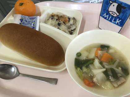 「きのこのドリア」はあさから米を湯に浸して作っています。季節の果物「みかん」が登場し、今日もおいしくいただきました。