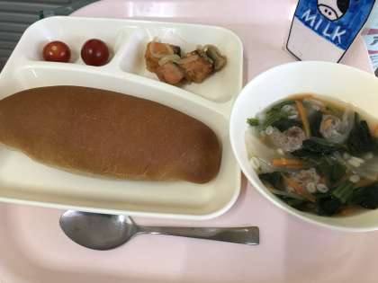 さけのマリネ 肉団子と麦のスープ プチトマト 黒糖パン 牛乳