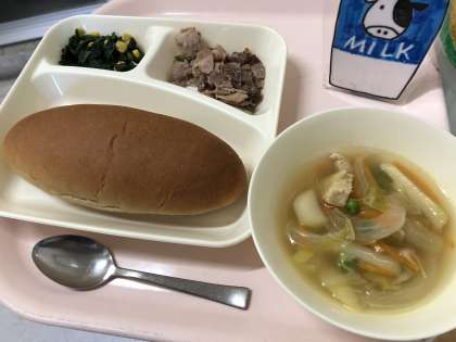 豚肉のガーリック焼き スープ ほうれん草のソテー 黒糖パン 牛乳