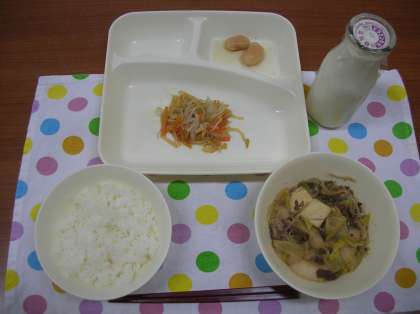 すき焼き煮、甘酢あえ、白花豆の煮もの、ごはん、牛乳