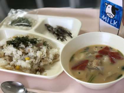 1月に給食には、お節料理のメニューがたびたび登場します。今日の「ごまめ」は少々苦くで苦労した子もいましたが、「ぞう煮」があたたかくめちゃめちゃおいしかったそうです。
