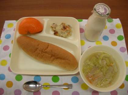 押し麦のグラタン、スープ、いよかん、ライ麦パン、牛乳