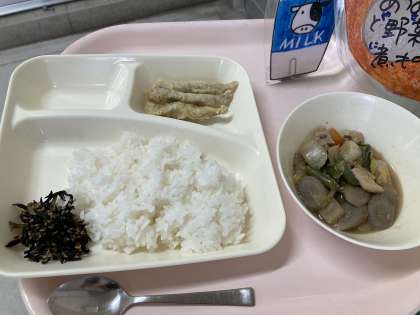 いわしてんぷら あつあげと野菜の煮もの ごまひじき ごはん 牛乳