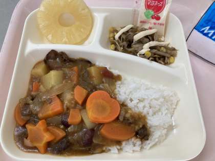 近江牛と金時豆のカレーライス ごぼうサラダ パインアップル(缶) 牛乳