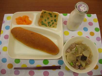 豚肉とだいこんのにもの、チヂミ、みかん(かんづめ)、パンプキンパン、牛乳