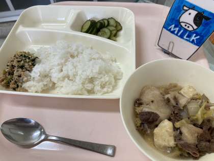 すき焼き煮 きゅうりのゆずの香あえ ツナっ葉いため ごはん 牛乳