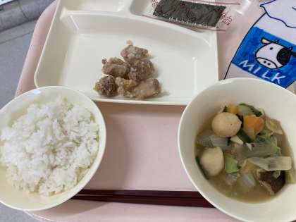 鶏肉のからあげ まる天と野菜のうま煮 焼きのり ごはん 牛乳