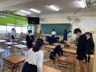 本日は、月一回のたてわり清掃の日です。もうすっかり掃除の仕方にも慣れ、どの教室もてきぱきと掃除をこなしていました。1年生の子達もとても上手にほうきや雑巾を扱っています。