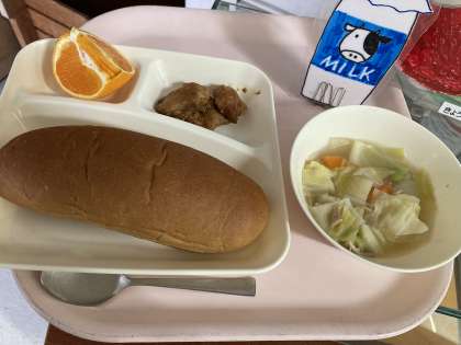 鶏肉のみそバターソース スープ煮 デコポン 黒糖パン 牛乳