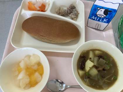 フライドチキン カレーシチュー お祝いピクルス フルーツゼリー 黒糖パン 牛乳