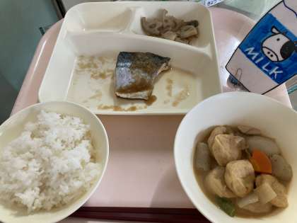 さごしのおろしじょうゆかけ 一口がんもとさといものみそ煮 れんこんのいためもの ごはん 牛乳
