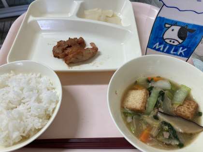 鶏肉のチリソース焼き 中華煮 だいこんの中華あえ ごはん 牛乳