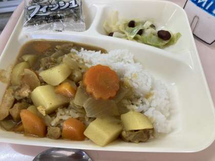 チキンカレーライス ビーンズサラダ ミニフィッシュ 牛乳