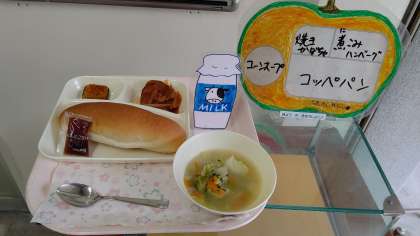 煮込みハンバーグ コーンスープ 焼きカボチャ コッペパン 牛乳