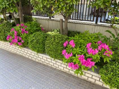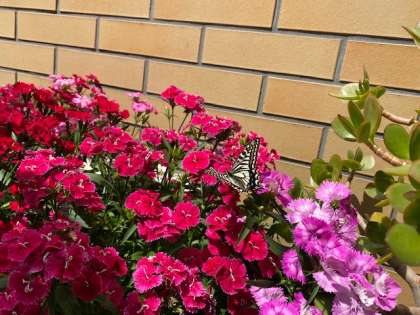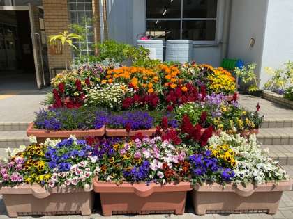 ふくふく広場にあるツツジやパンジーなど、いろいろな花がとてもきれいに咲いています。花のまわりにはチョウもとんできています。春らしさを感じる今日この頃です。