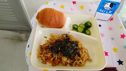 焼きそば きゅうりのしょうがづけ 黒糖1/2パン 牛乳