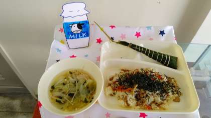 『きんぴらちらし』は、具をご飯に混ぜ、食べる時にきざみのりをかけます。『ちまき』は、原材料は全て国産で、市販されているものと比べ、糖分を控えた大阪市独自のものとして作られています。こどもの日の行事献立として毎年登場しています。