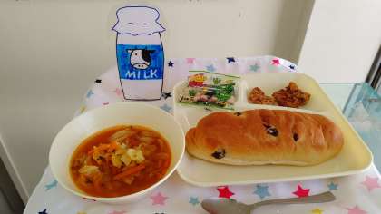 一口トンカツ ミネストローネ 豆こんぶ レーズンパン 牛乳