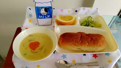 コーンクリームシチュー キャベツときゅうりのサラダ かわちばんかん おさつぱん 牛乳