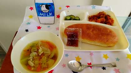 『じゃがいものミートグラタン』は、じゃがいもにケッチャップ味のミートソースを合わせたグラタンです。焦げ目が香ばしく、食欲をそそる児童に人気の献立です。粉末チーズを使用していないので、乳アレルギーのある児童も食べる事ができます。