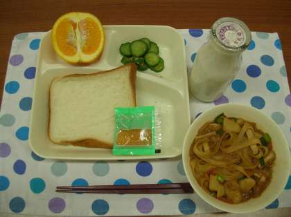 みそきしめん、あっさりきゅうり、清見オレンジ、食パン(りんごジャム)、牛乳