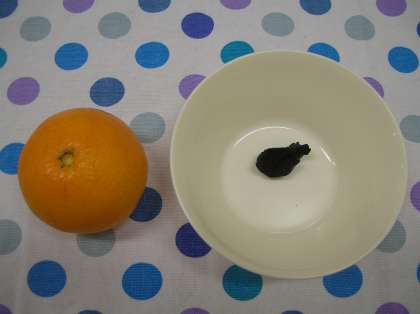 八丁みそは大豆と塩だけで作ります。愛知県のメーカーが作ったみそで、大豆も愛知県内で育てた大豆を使ったみそです。2枚目の写真は、清見オレンジと八丁みそです。(栄養教諭)