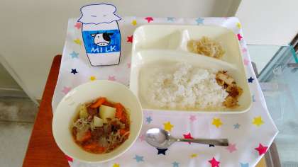 『肉じゃが』は、牛肉、じゃがいもを主材に、糸こんにゃく、玉ねぎ、にんじんを使った毎回好評な定番の煮物です。ごまかかいためは、旬のたけのこを、かつおぶし、いりごまとともに炒めたご飯のすすむ献立で美味しく頂きました。