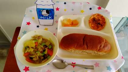 『変わりピザ』は、ツナ缶、コーン、ピーマン、ピザソース、チーズを混ぜ合わせて、ぎょうざの皮の上にのせ、焼き物機で焼く人気の献立です。今日は今月のチャレンジデー。みんなで力を合わせて完食を目指します。どのクラスもみんな頑張りました。